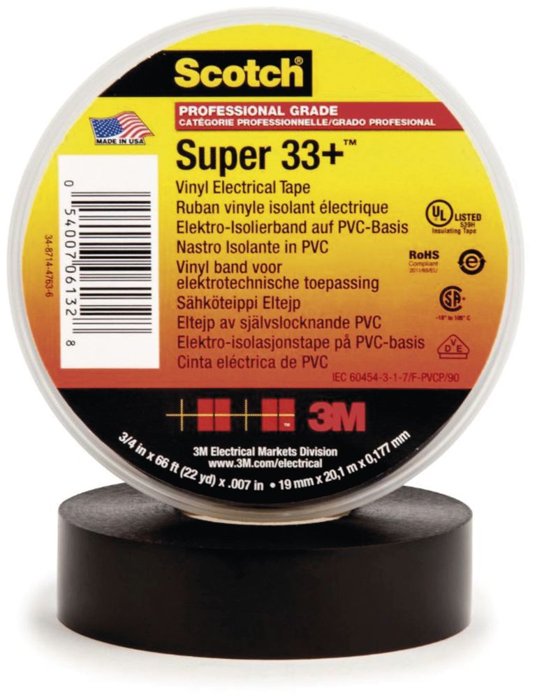 Designed for primary electrical insulation for all wire and cable connections with a voltage of up to 600 V, Super 33+T Vinyl Electrical Insulation Tape is the original, market-leading PVC insulation tape. This professional tape combines an elastic carrier material with a strong adhesive - for moisture-tight electrical and mechanical protection with minimal bulk. Suitable for temperatures down to -18 °C, this tape remains highly conformable and flexible without becoming brittle. It is designed for high performance in ambient temperatures of up to 105 °C.