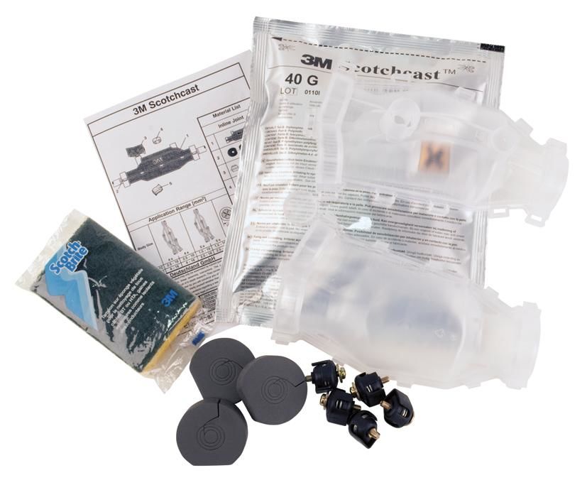 The 3MT ScotchcastT Cast Resin Joint Kit of the 92-NBA series is designed for one to five-core, unshielded low-voltage plastic cables. It ensures electrical insulation and mechanical protection of cable joints. The SVHC-free, premium joint kit, tested according to EN 50393, can be used indoors and outdoors, underground or underwater. The transparent, one-piece potting shell can be folded up in an instant and closes with an automatic snap-in. Pre-formed, perforated foam seals are also used. This eliminates the previously time-consuming use of a saw and adhesive tape for a tight seal. A GMG system (closed mixing and pouring) is used when casting the 3MT ScotchcastT casting resin 40 included in the delivery. This means that contact with the casting resin during processing is practically impossible. The transparent mixing bag guarantees visual control of the mixing process. After use, the mixing bag with the remaining hardened casting resin can be disposed of as normal household waste. Disposal as hazardous waste is not necessary.
