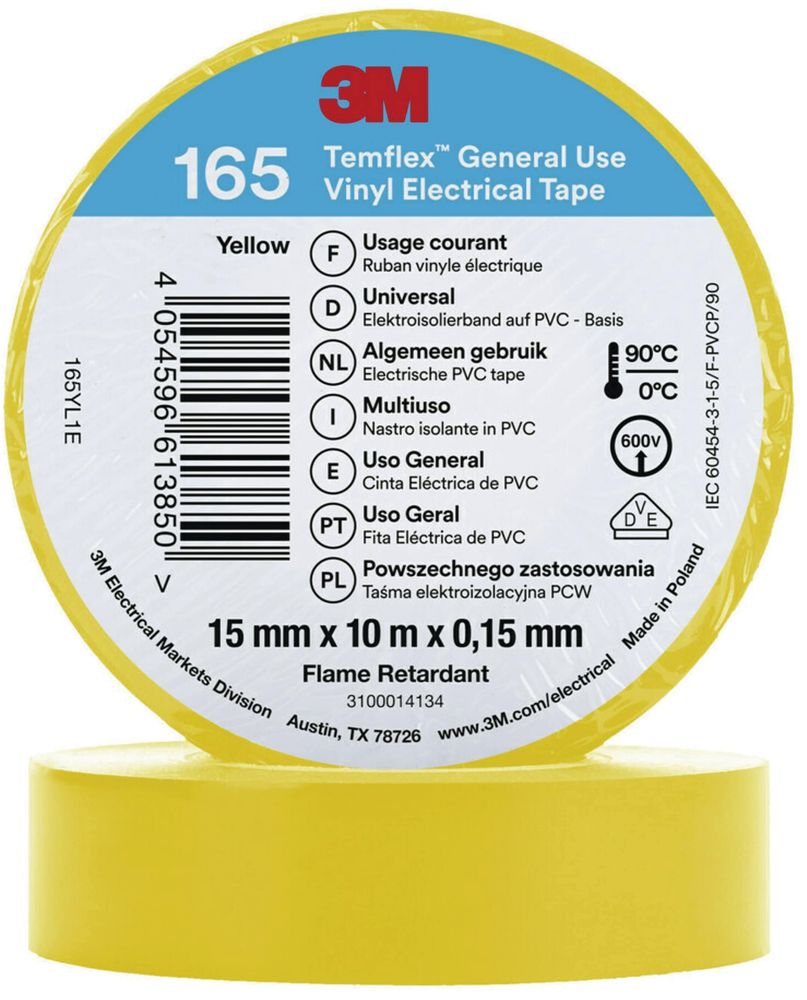 3M 165YL1E Temflex 15mmx10m Yellow Vinyl Insulation Tape 0.15mm 7100184732