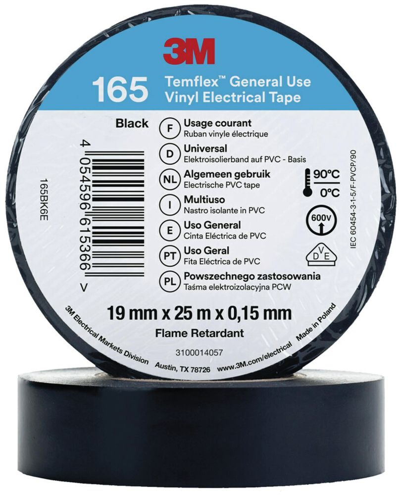 3M 165BK6E Temflex 19mmx25m Black Vinyl Insulation Tape 0.15mm 7100184810