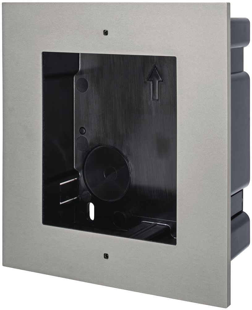 When installing ModuVis modules (video module, bell button module, etc.) you have the choice between surface and flush mounting. And you can choose between a 1-way installation frame (for 1 module), 2-way and 3-way frame (for 3 modules). This installation frame is suitable for flush mounting of 1 module.