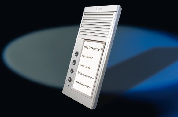 The analog AGFEO door intercom DoorSpeak 4, like the DoorSpeak 1+2, has practical solutions for example: convenient installation, flexible operating options, protection class IP 33 and much more. The door intercom is connected via an analog extension of the telephone system. The flat aluminum housing is only 22 mm deep, equipped with four bell buttons and suitable for surface mounting.
