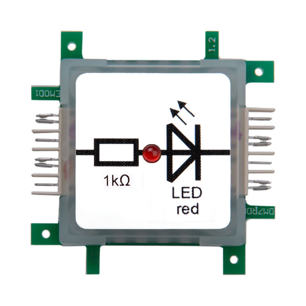 The red LED (Light Emitting Diode) is protected against overload with a series resistor. It only lights up when the diode is connected in the direction of flow, i.e. the current flows from the anode to the cathode. LEDs require a minimum voltage in the direction of flow in order to light up. For red LEDs it is approx. 1.5V.