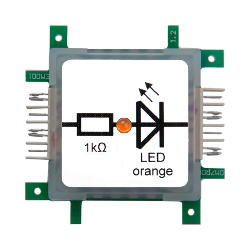 The orange LED (Light Emitting Diode) is protected against overload with a series resistor. It only lights up when the diode is connected in the direction of flow, i.e. the current flows from the anode to the cathode. LEDs require a minimum voltage in the direction of flow in order to light up. For orange LEDs this is approx. 1.8V.
