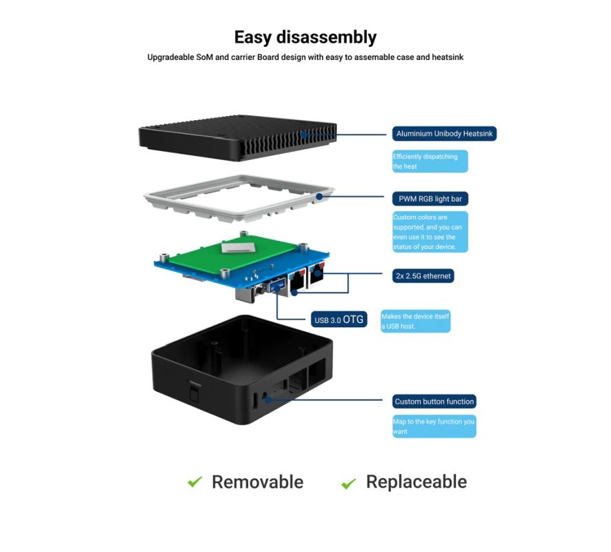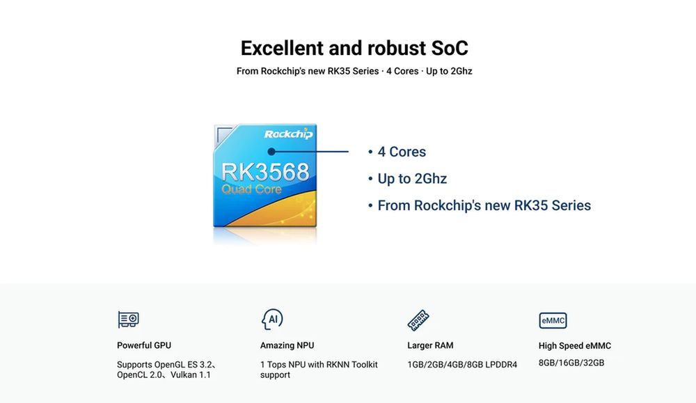 Hardware overview:Upgradable SoM and carrier board design with easy-to-install case and heatsink Rockchip RK3568 with Quadcore Cortex-A55 (ARM v8) 64-bit SoC @ 2.0GHz Mali G52- GPU, supports OpenGL ES 3.2/OpenCL 2.0/Vulkan 1.1 1Tops NPU with RKNN toolkit support 1GB/ 2GB/ 4GB/ 8GB LPDDR4 RAM expansion via M.2 and mini PCIe interface for 4G/5G mobile network Interfaces: 1x USB C for power supply and serial Console management 2x 2.5G Ethernet 1x M.2 port for 4G LTE network or M.2 SATA 2242 1x mini PCIe port for AP WiFi or 5G mobile network 1x SD card for storage or OS 1x Nano SIM card slot 1x USB3 type A 5Gbps OTG ports 1x user button 26x user GPIO supporting various interface options: - up to 3 x UART