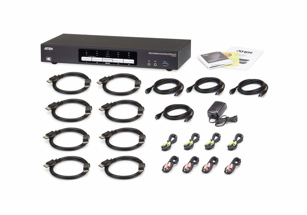 1x 4-Port USB 3.0 4K DisplayPort Dual Display KVMP Switch 8x LIN5-20K1-K13G DisplayPort 1.2 cable 4x LIN6-11C1-E12G USB 3.0 cable 8x LIN5-0205-21CG/LIN5-0205-21DG audio cable 1x LIN2-418K-E12G Power supply 1x user manual