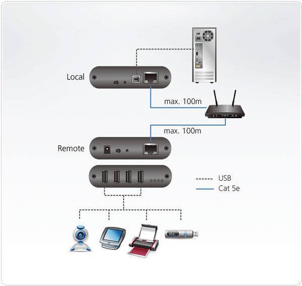 The UEH4102 offers true USB 2.0 extension at up to 480 Mbps over a Gigabit Ethernet Local Area Network (LAN). The local and remote devices are connected via MAC address; no pairing actions are required during installation.