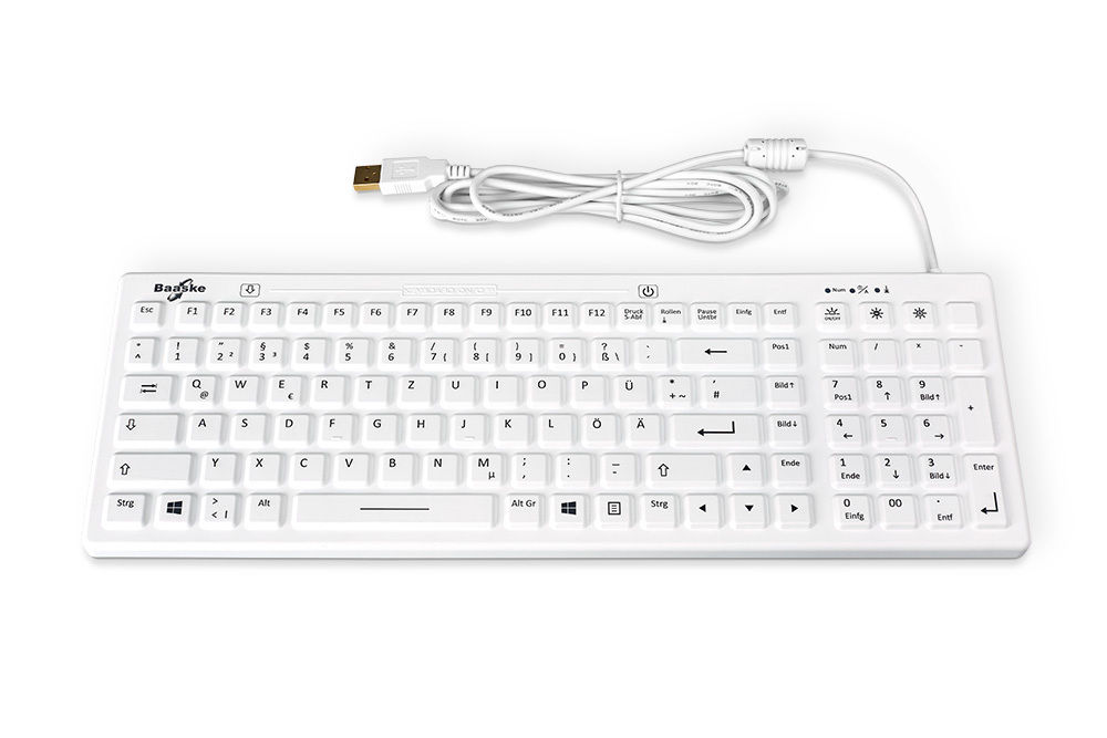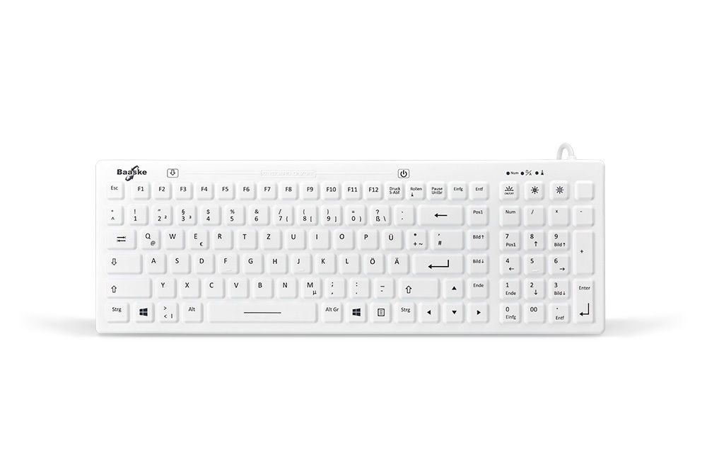 Work comfortably in the dark. The Baaske BL01 hygienic keyboard is ideal for low-light and dim environments such as operating rooms or X-ray workstations. The step-adjustable backlighting can be individually adjusted to the lighting conditions and can be turned off via a separate button when needed.