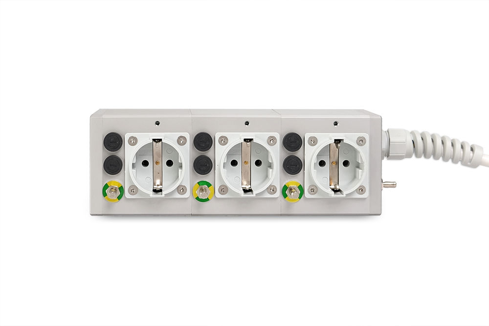The MEDX ZPA power strip is the ideal solution for medical systems requiring flexible and secure power distribution. Its modular design allows it to be tailored precisely to your needs, accommodating anywhere from one to eight outlets as desired. The innovative structure enables each outlet to be configured without sacrificing essential safety features. Each module is equipped with an additional potential equalization (ZPA) and two G-fuses to ensure maximum safety. The strip also doubles as a ZPA distributor, making it perfect for medical environments.
