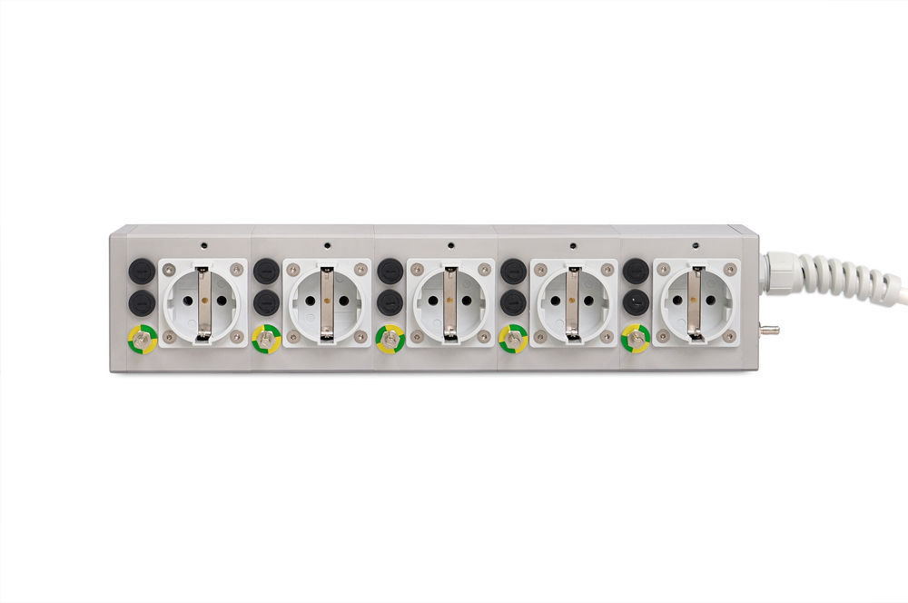 The MEDX ZPA power strip offers the ideal solution for systems requiring flexible and secure power distribution. This 5-socket power strip perfectly balances load management and space efficiency, and can be tailored to meet individual requirements. Its modular design allows for configuration without compromising on essential safety features. Each module is equipped with an additional potential equalization (ZPA) and two G-fuses, providing the highest level of safety. The strip also features an additional potential equalization on the housing, enabling it to function as a local ZPA distributor.