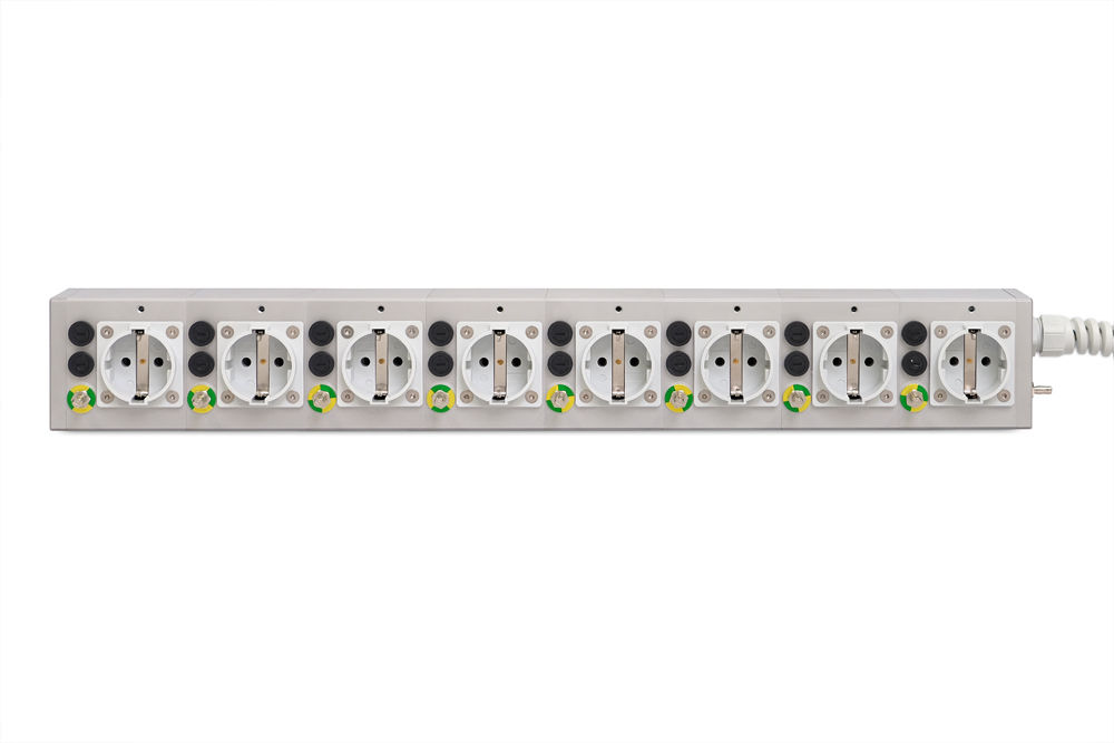 The MEDX ZPA power strip provides a tailored solution for your individual systems. This 8-socket power strip perfectly adapts to the specific requirements and space constraints of your setup. With its modular design, up to eight sockets can be incorporated without compromising on essential safety features. Each module is equipped with an additional potential equalization (ZPA) and two G-fuses, ensuring the highest level of safety. Furthermore, the strip includes an additional potential equalization on the housing, allowing it to serve as a local ZPA distributor.