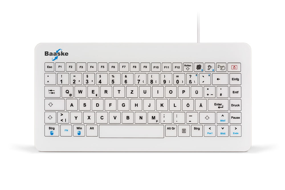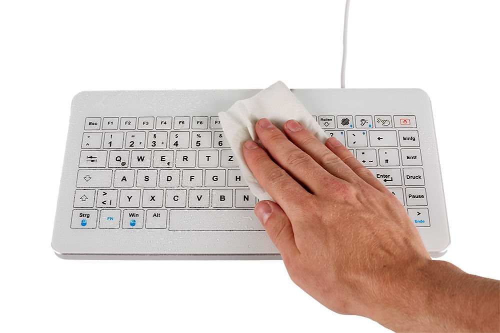 The Baaske GL01M glass keyboard is a high-quality keyboard with a glass surface. Designed for long-lasting use in the medical field, its features far exceed those of regular office keyboards. The front is made of easy-to-clean tempered glass, supported by a robust ABS plastic housing. This combination of materials allows for extremely quiet operation, ideal for environments where noise levels need to be kept as low as possible. If needed, key feedback (acoustic and vibration) can be activated. For optimal use, the e-medic™ glass keyboard also has an optional touchpad.