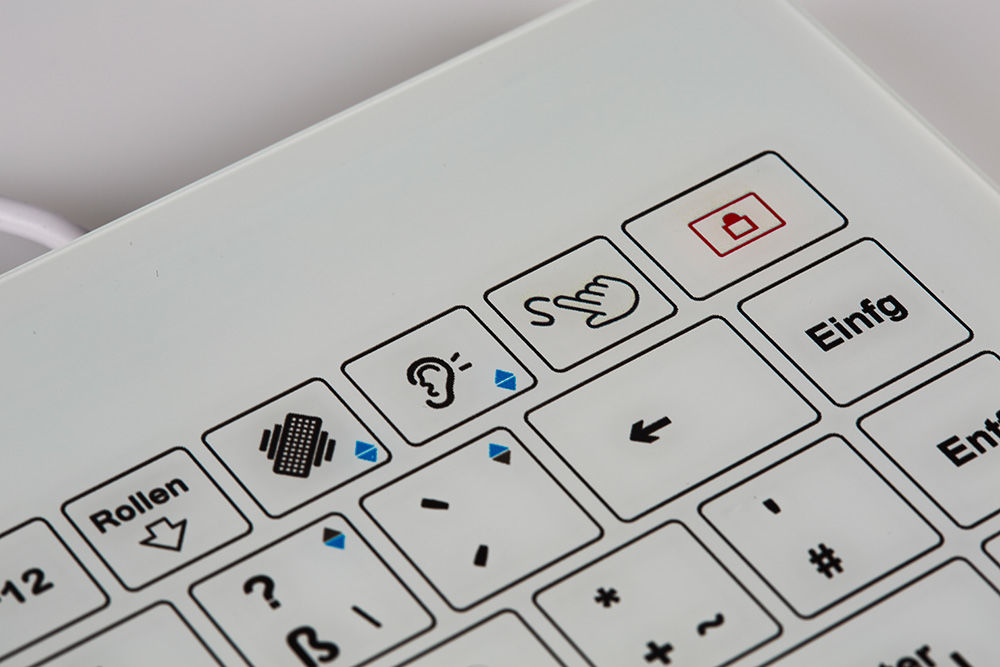 For cleaning during operation, the Baaske glass keyboard has a built-in keylock. It is activated and deactivated by holding down the lock key (lock symbol). A small LED on the key indicates whether the lock function is on or off.