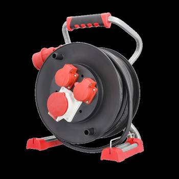 Professional cable drum Drum body made of robust, highly break-resistant special plastic 2x protective contact sockets including hinged lid IP44 1x CEE socket 400V/16A 5-pin 25.0m rubber hose cable H07RN-F 3G 1.5mm² with protective contact plug CEE7/7 Stable, shock-absorbing professional double tube frame with star grip brake Ergonomic, non-slip 2-component handle Integrated cable guide Including thermal protection switch For use outdoors and on construction sites Packed in a box