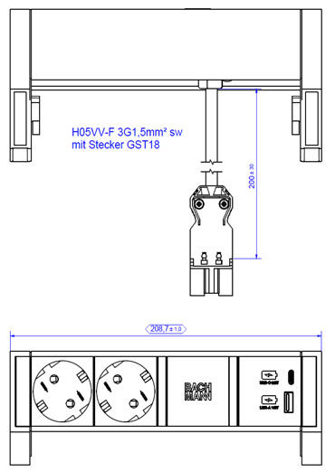 Bachmann Desk2 power strip, 2x sockets (CEE7) + 1xUSB A&C 22W charger with supply cable GST18 0.2m, white
