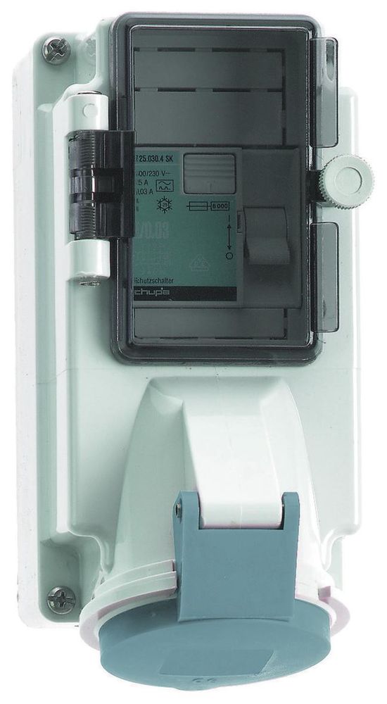 Other technical features: The cable entry is open once at the top and closed twice at the bottom, The housing base can be rotated by 180°, With built-in residual current circuit breaker 25/0.03A 2-pole