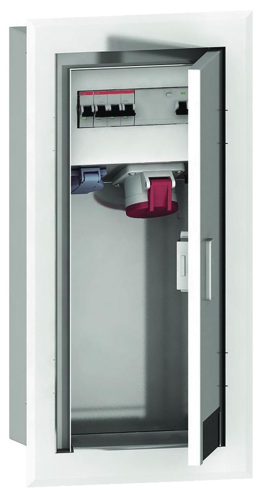via a front brush lock. Device height: 510 mm, device width: 220 mm, device depth: 200 mm Equipment: 1 x mounting bracket 1 x earthed socket 16A 230V IP44 blue 1 x CEE socket 16A 400V 5p 6h IP44 Fuse/protective measure: 1 x C-automatic 16A 1p 1 x C-automatic 16A 3p 1 x residual current device 40/0.03A 4p Cable entry/connection option: 1 x M32 bottom 1 x M40 bottom (no cable entries above) 1 x meter terminal block 5x25 mm² / type: C (suitable for conductor rail) Additional information: Wired and ready for connection.
