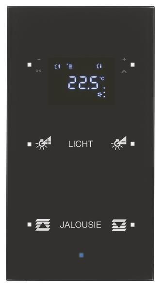 2-way glass sensor configured with TS sensor temperature controller, black. 2-way glass sensor with labeling, with all-round bevel, creation of individual labeling via Internet configuration software, without visible fastening elements, with four control surfaces, LED display with symbol representation to show operating mode, controller lock, room and outside temperature, time (timer required), with 2 additional display sensor surfaces, with a blue operating LED, with four white status LEDs, flush-mounted installation, special program. Control element for room-specific and cross-room control of functions. For individual single-room temperature control, actuation by touching the glass plate (capacitive detection), flat design and high switching reliability by applying the conductor tracks directly to the glass plate, for installation in a special mounting box for flush-mounting and hollow walls, height and side compensation when installed in a special mounting box, with adapter ring for dismantling protection and shadow gap formation. For vertical installation, with dismantling tool, with integrated bus coupler, bus connection via connection terminal. Display menu scope for operation can be parameterized. For switching, touch, dimming, blinds, room temperature controller functions, value transmitter for dimming, position, brightness and temperature values 1 and 2 bytes, single and double surface operation can be parameterized, sensor surfaces can be locked via object, controller operating modes: comfort, standby, night and frost/heat protection operation. For heating and/or cooling operation with/without additional stage, control parameters for heating or cooling elements preset. For continuous (PI) or switching (2-point) control, temperature measurement via internal and/or external, connectable sensor with averaging, signal objects for heating and cooling, with valve protection function, object for controller status, with key lock function.