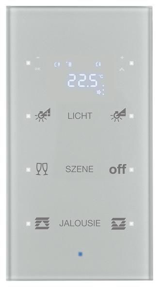 3-way glass sensor with temperature controller TS sensor configured, aluminum. 3-way glass sensor with labeling, with all-round bevel, creation of individual labeling via Internet configuration software, without visible fastening elements, with six control surfaces, LED display with symbol representation to show operating mode, controller lock, room and outside temperature, time (timer required), with 2 additional display sensor surfaces, with a blue operating LED, with four white status LEDs, flush-mounted installation, special program. Control element for room-specific and cross-room control of functions. For individual single-room temperature control, actuation by touching the glass plate (capacitive detection), flat design and high switching reliability by applying the conductor tracks directly to the glass plate, for installation in a special mounting box for flush-mounting and hollow walls, height and side compensation when installed in a special mounting box, with adapter ring for dismantling protection and shadow gap formation. For vertical installation, with dismantling tool, with integrated bus coupler, bus connection via connection terminal. Display menu scope for operation can be parameterized. For switching, touch, dimming, blinds, room temperature controller functions, value transmitter for dimming, position, brightness and temperature values 1 and 2 bytes, single and double surface operation can be parameterized, sensor surfaces can be locked via object, controller operating modes: comfort, standby, night and frost/heat protection operation. For heating and/or cooling operation with/without additional stage, control parameters for heating or cooling elements preset. For continuous (PI) or switching (2-point) control, temperature measurement via internal and/or external, connectable sensor with averaging, signal objects for heating and cooling, with valve protection function, object for controller status, with key lock function.