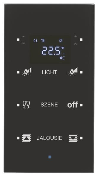 3-way glass sensor configured with TS sensor temperature controller, black. 3-way glass sensor with labeling, with all-round bevel, creation of individual labeling via Internet configuration software, without visible fastening elements, with six control surfaces, LED display with symbol representation to show operating mode, controller lock, room and outside temperature, time (timer required), with 2 additional display sensor surfaces, with a blue operating LED, with four white status LEDs, flush-mounted installation, special program. Control element for room-specific and cross-room control of functions. For individual single-room temperature control, actuation by touching the glass plate (capacitive detection), flat design and high switching reliability by applying the conductor tracks directly to the glass plate, for installation in a special mounting box for flush-mounting and hollow walls, height and side compensation when installed in a special mounting box, with adapter ring for dismantling protection and shadow gap formation. For vertical installation, with dismantling tool, with integrated bus coupler, bus connection via connection terminal. Display menu scope for operation can be parameterized. For switching, touch, dimming, blinds, room temperature controller functions, value transmitter for dimming, position, brightness and temperature values 1 and 2 bytes, single and double surface operation can be parameterized, sensor surfaces can be locked via object, controller operating modes: comfort, standby, night and frost/heat protection operation. For heating and/or cooling operation with/without additional stage, control parameters for heating or cooling elements preset. For continuous (PI) or switching (2-point) control, temperature measurement via internal and/or external, connectable sensor with averaging, signal objects for heating and cooling, with valve protection function, object for controller status, with key lock function.
