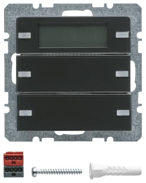 2-way push button sensor with labeling fields, RTR, display Q.1/Q.3 anthracite, velvet. 2-way push button sensor with room temperature controller display with integrated bus coupler, for local operation of switching, touch, dimming, blinds, room temperature controller functions, with dismantling protection, with white operating and four orange status LEDs, LC display with symbol representation, buttons can be labeled over the entire surface, with 2 additional display buttons for programming via display. Application properties: display menu scope for operation can be parameterized, display of operating mode, controller lock, room and outside temperature, time (timer required), operating LED can be switched via object alarm telegram after disconnecting the bus coupler 1 bit or 1 byte. Touch sensor functions: switching, touch, dimming, blind functions programmable, function 2 telegrams programmable, value transmitter for dimming, brightness and temperature values 1 and 2 bytes, calling up, setting and saving of 8 light scenes, cyclical sending also possible via extension, buttons or rockers can be parameterized, single-surface operation for switching, buttons, blinds and dimming, area dimming, blind operating concepts short-long-short and long-short can be parameterized, rockers or touch sensor can be locked via object Room temperature control function: with room temperature timer. For individual single room control, controller operating modes comfort, standby, night and frost/heat protection operation. For heating and/or cooling operation with/without additional stage, control parameters for heating or cooling elements preset. For continuous or switching control of max. 2 control circuits, temperature measurement via internal and/or external sensor with averaging, presence button programmable on touch sensor for comfort extension, touch sensor buttons as controller extension and for operating mode switching, setpoint shift, room temperature timer operation programmable, separate window contact object, reporting objects for heating and cooling, with valve protection function, object for controller status. Flush-mounted installation, surface program. Material: plastic, thermoplastic, shatter-proof, high-gloss surface, halogen-free.