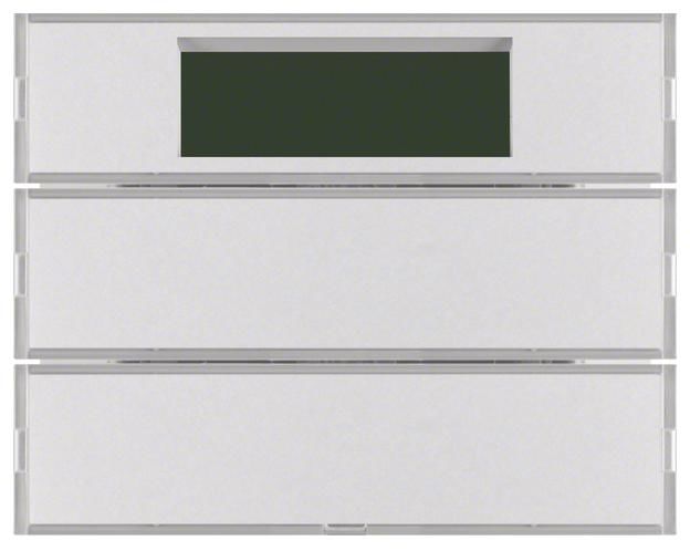 2-way push button sensor with RTR, display K.5 alu. 2-way push button sensor with room temperature controller, display for local operation of switching, touch, dimming, blinds, room temperature controller functions, with dismantling protection, with white operating and fourth red status LED, LC display with symbol representation, buttons can be written on over the entire surface, with 2 additional display buttons for programming via display, for plugging onto bus coupler Up. Application properties: display menu scope for operation can be parameterized, display of operating mode, controller lock, room and outside temperature, time (timer required), operating LED can be switched via object alarm telegram after disconnecting bus coupler 1 bit or 1 byte. Touch sensor functions: Switching, touch, dimming, blind functions programmable, function 2 telegrams programmable, value transmitter for dimming, brightness and temperature values 1 and 2 bytes, extension for light scene touch sensor, cyclical sending also possible via extension, buttons or rockers can be parameterized, single-surface operation for switching, buttons, blinds and dimming, area dimming, blind operating concepts short-long-short and long-short can be parameterized, rockers or touch sensor can be locked via object. Room temperature control function: with room temperature timer. For individual single room control, controller operating modes comfort, standby, night and frost/heat protection operation. For heating and/or cooling operation with/without additional stage, control parameters for heating or cooling elements preset. For continuous or switching control of max. 2 control circuits, temperature measurement via internal and/or external sensor with averaging, presence button programmable on touch sensor for comfort extension, touch sensor buttons as controller extension and for operating mode switching, setpoint shift, room temperature timer operation programmable, separate window contact object, reporting objects for heating and cooling, with valve protection function, object for controller status. Flush-mounted installation, surface program. Material: plastic, thermoplastic, shatter-proof, high-gloss surface, halogen-free.