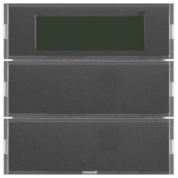 2-way push button sensor with RTR, display B.3/B.7. 2-way push button sensor with room temperature controller, display with label inserts for white and polar white, for local operation of switching, touch, dimming, blinds and room temperature controller functions, with dismantling protection, with white operating LED and fourth red status LED, LC display with symbol representation, buttons can be labelled over the entire surface, with 2 additional display buttons for programming via display, for plugging onto bus coupler Up. Application properties: display menu scope for operation can be parameterised, display of operating mode, controller lock, room and outside temperature, time (timer required), operating LED can be switched via object alarm telegram after disconnecting bus coupler 1 bit or 1 byte. Touch sensor functions: Switching, touch, dimming, blind functions programmable, function 2 telegrams programmable, value transmitter for dimming, brightness and temperature values 1 and 2 bytes, extension for light scene touch sensor, cyclical sending also possible via extension, buttons or rockers can be parameterized, single-surface operation for switching, buttons, blinds and dimming, area dimming, blind operating concepts short-long-short and long-short can be parameterized, rockers or touch sensor can be locked via object. Room temperature control function: with room temperature timer. For individual single room control, controller operating modes comfort, standby, night and frost/heat protection operation. For heating and/or cooling operation with/without additional stage, control parameters for heating or cooling elements preset. For continuous or switching control of max. 2 control circuits, temperature measurement via internal and/or external sensor with averaging, presence button programmable on touch sensor for comfort extension, touch sensor buttons as controller extension and for operating mode switching, setpoint shift, room temperature timer operation programmable, separate window contact object, reporting objects for heating and cooling, with valve protection function, object for controller status. Flush-mounted installation, surface program. Material: plastic, thermoplastic, shatter-proof, high-gloss surface, halogen-free.