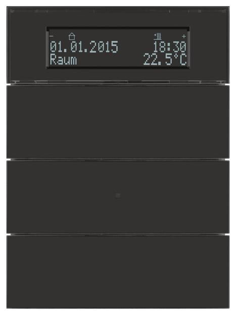 3-way push button sensor with temperature controller and display B.IQ glass, black. B.IQ 3-way push button sensor with temperature controller and display (RTR display), frameless, three rockers, with operating LED, blue and six status LEDs, white, display, dark with white illuminated lettering, with dismantling protection. Flush-mounted installation. KNX user module for plugging onto bus coupler plus Up via user interface (AST). Combination device consisting of push button sensor and room temperature controller with room temperature timer and two weekly timers, 3 rockers for operating building functions in any combination, two-line display with additional symbol line, with two additional integrated buttons for setting and reading room temperature, room temperature timer, weekly timers, basic settings and display of date, time, outside temperature and 14-byte message texts (EIS 15). Display: lighting on, automatic switch-off, switching via object. Labeling possible via optional label fields, lighting via status LED. Alarm message after disconnection from the flush-mounted bus coupler as a 1-bit switching telegram, 1- or 2-byte value telegram, operation can be locked via object, touch sensor: operating concept per rocker as 2 buttons (2 objects) or rocker (1 object), button help with plain text display, button functions: switching/buttons, dimming, single-surface operation (switching/buttons, dimming, blinds) possible, blinds, value transmitter EIS 6 (1 byte), light scene recall with/without memory function, value transmitter 2 bytes, operating mode switching for controller operation, timer operation. Rocker functions: switching, dimming, blinds each with/without single-surface operation, operating mode switching for controller operation. Room temperature controller: individual room temperature control, recording of the current room temperature and processing into a control variable. Controller operation buttons to the left and right of the display: operating mode switching (comfort, standby, night, frost/heat protection mode), temperature setpoints. Operating modes: heating, cooling or heating and cooling, basic and additional heating/cooling or basic and additional heating and cooling, controller can be switched off (dew point mode) or controller or operation of the controller can be locked, valve protection function. Control types: Continuous PI control, switching PI control (PWM), switching 2-point control (on/off), presence button can be parameterized to extend comfort, temperature detection via internal and/or external sensor (averaging possible), control variable objects can be inverted, signaling objects for heating and cooling, object for controller status, preset control parameters for common heating or cooling elements, separate window contact object, room temperature timer: time-dependent adjustment of the operating modes comfort, standby, night operation, weekly program, max. 28 switching times, locking via object. Weekly timers: switching function, 1-byte value transmitter, light scene extension, max. 14 switching times, locking of the timers via object.