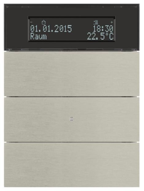 3-way push button sensor with temperature controller and display B.IQ stainless steel. B.IQ 3-way push button sensor with temperature controller and display (RTR display), frameless, three rockers, with operating LED, blue and six status LEDs, white, display, dark with white illuminated lettering, with dismantling protection. Flush-mounted installation. EIB user module for plugging onto bus coupler plus Up via user interface (AST). Combination device consisting of push button sensor and room temperature controller with room temperature timer and two weekly timers, 3 rockers for operating building functions in any combination, two-line display with additional symbol line, with two additional integrated buttons for setting and reading room temperature, room temperature timer, weekly timers, basic settings and display of date, time, outside temperature and 14-byte message texts (EIS 15). Display: lighting on, automatic switch-off, switching via object. Labeling possible via optional label fields, lighting via status LED. Alarm message after disconnection from the flush-mounted bus coupler as a 1-bit switching telegram, 1- or 2-byte value telegram, operation can be locked via object, touch sensor: operating concept per rocker as 2 buttons (2 objects) or rocker (1 object), button help with plain text display, button functions: switching/buttons, dimming, single-surface operation (switching/buttons, dimming, blinds) possible, blinds, value transmitter EIS 6 (1 byte), light scene recall with/without memory function, value transmitter 2 bytes, operating mode switching for controller operation, timer operation. Rocker functions: switching, dimming, blinds each with/without single-surface operation, operating mode switching for controller operation. Room temperature controller: individual room temperature control, recording of the current room temperature and processing into a control variable. Controller operation buttons to the left and right of the display: operating mode switching (comfort, standby, night, frost/heat protection mode), temperature setpoints. Operating modes: heating, cooling or heating and cooling, basic and additional heating/cooling or basic and additional heating and cooling, controller can be switched off (dew point mode) or controller or operation of the controller can be locked, valve protection function. Control types: Continuous PI control, switching PI control (PWM), switching 2-point control (on/off), presence button can be parameterized to extend comfort, temperature detection via internal and/or external sensor (averaging possible), control variable objects can be inverted, signaling objects for heating and cooling, object for controller status, preset control parameters for common heating or cooling elements, separate window contact object, room temperature timer: time-dependent adjustment of the operating modes comfort, standby, night operation, weekly program, max. 28 switching times, locking via object. Weekly timers: switching function, 1-byte value transmitter, light scene extension, max. 14 switching times, locking of the timers via object.