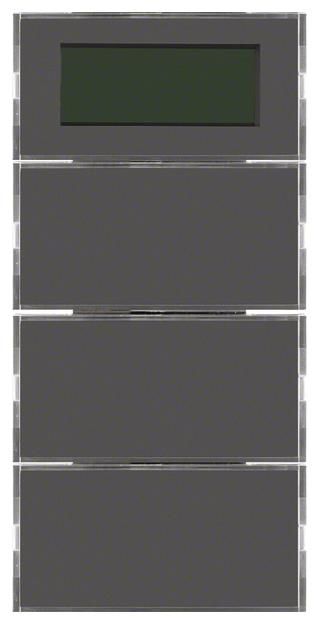3-way push button sensor with RTR, display B.3/B.7. 3-way push button sensor with room temperature controller, display with label inserts for white and for local operation of switching, touch, dimming, blinds, room temperature controller functions, with dismantling protection, with white operating and six red status LEDs, LC display with symbol representation, buttons can be labeled over the entire surface, with 2 additional display buttons for programming via display, for plugging onto bus coupler Up. Application properties: display menu scope for operation can be parameterized, display of operating mode, controller lock, room and outside temperature, time (timer required), operating LED can be switched via object alarm telegram after disconnecting bus coupler 1 bit or 1 byte. Touch sensor functions: Switching, touch, dimming, blind functions programmable, function 2 telegrams programmable, value transmitter for dimming, brightness and temperature values 1 and 2 bytes, extension for light scene touch sensor, cyclical sending also possible via extension, buttons or rockers can be parameterized, single-surface operation for switching, buttons, blinds and dimming, area dimming, blind operating concepts short-long-short and long-short can be parameterized, rockers or touch sensor can be locked via object. Room temperature control function: with room temperature timer. For individual single room control, controller operating modes comfort, standby, night and frost/heat protection operation. For heating and/or cooling operation with/without additional stage, control parameters for heating or cooling elements preset. For continuous or switching control of max. 2 control circuits, temperature measurement via internal and/or external sensor with averaging, presence button programmable on touch sensor for comfort extension, touch sensor buttons as controller extension and for operating mode switching, setpoint shift, room temperature timer operation programmable, separate window contact object, reporting objects for heating and cooling, with valve protection function, object for controller status. Flush-mounted installation, surface program. Material: plastic, thermoplastic, shatter-proof, high-gloss surface, halogen-free.