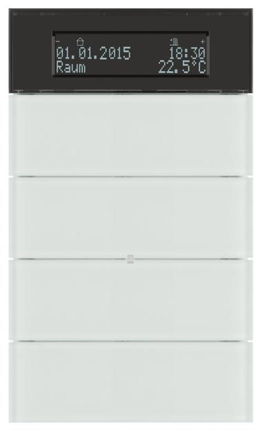 4-way push button sensor with temperature controller and display B.IQ glass, polar white. B.IQ 4-way push button sensor with temperature controller and display (RTR display), frameless, four rockers, with operating LED, blue and eight status LEDs, white, display, dark with white illuminated lettering, with dismantling protection. Flush-mounted installation. EIB user module for plugging onto bus coupler plus Up via user interface (AST). Combination device consisting of push button sensor and room temperature controller with room temperature timer and two weekly timers, 4 rockers for operating building functions in any combination, two-line display with additional symbol line, with two additional integrated buttons for setting and reading room temperature, room temperature timer, weekly timers, basic settings and display of date, time, outside temperature and 14-byte message texts (EIS 15). Display: lighting on, automatic switch-off, switching via object. Labeling possible via optional label fields, lighting via status LED. Alarm message after disconnection from the flush-mounted bus coupler as a 1-bit switching telegram, 1- or 2-byte value telegram, operation can be locked via object, touch sensor: operating concept per rocker as 2 buttons (2 objects) or rocker (1 object), button help with plain text display, button functions: switching/buttons, dimming, single-surface operation (switching/buttons, dimming, blinds) possible, blinds, value transmitter EIS 6 (1 byte), light scene recall with/without memory function, value transmitter 2 bytes, operating mode switching for controller operation, timer operation. Rocker functions: switching, dimming, blinds each with/without single-surface operation, operating mode switching for controller operation. Room temperature controller: individual room temperature control, recording of the current room temperature and processing into a control variable. Controller operation buttons to the left and right of the display: operating mode switching (comfort, standby, night, frost/heat protection mode), temperature setpoints. Operating modes: heating, cooling or heating and cooling, basic and additional heating/cooling or basic and additional heating and cooling, controller can be switched off (dew point mode) or controller or operation of the controller can be locked, valve protection function. Control types: Continuous PI control, switching PI control (PWM), switching 2-point control (on/off), presence button can be parameterized to extend comfort, temperature detection via internal and/or external sensor (averaging possible), control variable objects can be inverted, signaling objects for heating and cooling, object for controller status, preset control parameters for common heating or cooling elements, separate window contact object, room temperature timer: time-dependent adjustment of the operating modes comfort, standby, night operation, weekly program, max. 28 switching times, locking via object. Weekly timers: switching function, 1-byte value transmitter, light scene extension, max. 14 switching times, locking of the timers via object.