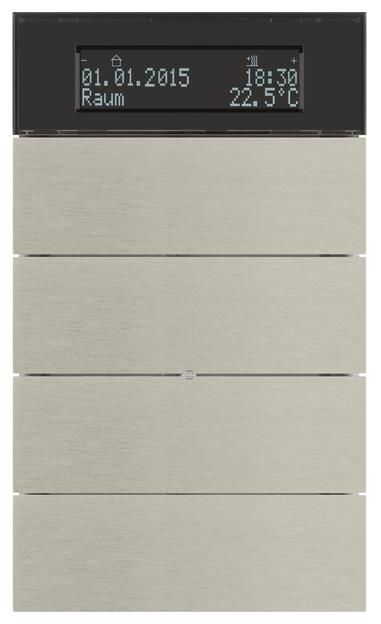 4-way push button sensor with temperature controller and display B.IQ stainless steel. KNX system description The KNX system is a flexible, upwardly compatible installation bus system (formerly EIB = European Installation Bus) for use in building system technology. It is specially tailored to special requirements in terms of comfort, the possibility of flexible use of space, the combination of central and decentralized control, the intelligent linking of trades and systems, communication options, environmental compatibility, the minimization of energy and operating costs as well as the functions of display, reporting, operation, monitoring and detection. Due to its decentralized structure, it enables building-specific operational management in residential and commercial buildings, regardless of the size of the system. The use of commercially available circuit distributors and installation boxes is particularly advantageous. All bus participants are connected via a bus cable (e.g. JY(St)Y 2x2x0.8) that complies with the KNX guidelines (Konnex Association). Since the bus line can be laid directly next to high-voltage lines according to DIN VDE 0100, the cable routing is greatly simplified. Compared to public telecommunications systems, the bus system with all its components is to be treated like a high-voltage system. As with high-voltage installations, the cable routing can be linear, star-shaped or tree-shaped. A combination of the different cable routings is generally permitted. The wiring is done using two-wire technology, with the wires colored red (for '+') and black (for '-') representing the preferred wires. The wires colored white and yellow serve as reserves. The participants are supplied with the bus voltage (protective extra-low voltage SELV 30 V DC) via the bus line. At the same time, it is used to transmit the information that is exchanged between the bus participants. A terminating resistor is not required for the bus line. The smallest unit in the KNX system is a participant. Each participant consists of a user module (AM) and a bus coupling unit (BA). AM and BA are connected to each other via the user interface (AST). Up to 64 participants can be connected to one line. Twelve lines can be connected to one another using line couplers and thus combined into one area. Up to 15 of these areas can be connected to one another using area couplers. Planning, parameterization, commissioning and diagnostics are carried out using the ETS (EIB tool software). The system documentation is also created using the ETS. During planning, each participant is assigned a unique physical address. This is made up of the number of the area, the line and the participant within the line. During commissioning, this physical address is first loaded into the BA.For this purpose, the PC is connected to the bus via a data interface (USB) at any point in the system. All BAs of a KNX system are programmed with the assigned applications from the manufacturer's database using the physical addresses. Each BA contains an EEPROM in which the physical address and the application are stored. In this way, the KNX system is protected against data loss in the event of a power failure. The following conditions apply when installing the KNX system: - The total length of all cables laid in a bus line must not exceed 1000 m! - The maximum length between two bus devices is 700 m! - The maximum cable length between the power supply (including choke) and each bus device must not exceed 350 m! - To avoid EMC interference caused by overvoltage, ensure that the bus cable does not form a closed loop at any point in the system! - The planning and parameterization as well as the commissioning