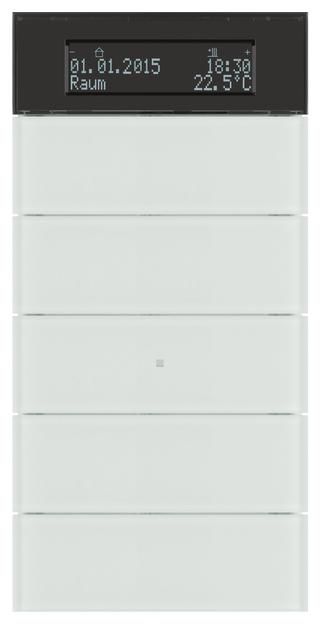 5-way push button sensor with temperature controller and display B.IQ glass, polar white. B.IQ 5-way push button sensor with temperature controller and display (RTR display), frameless, five rockers, with operating LED, blue and ten status LEDs, white, display, dark with white illuminated lettering, with dismantling protection. Flush-mounted installation. EIB user module for plugging onto bus coupler plus Up via user interface (AST). Combination device consisting of push button sensor and room temperature controller with room temperature timer and two weekly timers, 5 rockers for operating building functions in any combination, two-line display with additional symbol line, with two additional integrated buttons for setting and reading room temperature, room temperature timer, weekly timers, basic settings and display of date, time, outside temperature and 14-byte message texts (EIS 15). Display: lighting on, automatic switch-off, switching via object. Labeling possible via optional label fields, lighting via status LED. Alarm message after disconnection from the flush-mounted bus coupler as a 1-bit switching telegram, 1- or 2-byte value telegram, operation can be locked via object, touch sensor: operating concept per rocker as 2 buttons (2 objects) or rocker (1 object), button help with plain text display, button functions: switching/buttons, dimming, single-surface operation (switching/buttons, dimming, blinds) possible, blinds, value transmitter EIS 6 (1 byte), light scene recall with/without memory function, value transmitter 2 bytes, operating mode switching for controller operation, timer operation. Rocker functions: switching, dimming, blinds each with/without single-surface operation, operating mode switching for controller operation. Room temperature controller: individual room temperature control, recording of the current room temperature and processing into a control variable. Controller operation buttons to the left and right of the display: operating mode switching (comfort, standby, night, frost/heat protection mode), temperature setpoints. Operating modes: heating, cooling or heating and cooling, basic and additional heating/cooling or basic and additional heating and cooling, controller can be switched off (dew point mode) or controller or operation of the controller can be locked, valve protection function. Control types: Continuous PI control, switching PI control (PWM), switching 2-point control (on/off), presence button can be parameterized to extend comfort, temperature detection via internal and/or external sensor (averaging possible), control variable objects can be inverted, signaling objects for heating and cooling, object for controller status, preset control parameters for common heating or cooling elements, separate window contact object, room temperature timer: time-dependent adjustment of the operating modes comfort, standby, night operation, weekly program, max. 28 switching times, locking via object. Weekly timers: switching function, 1-byte value transmitter, light scene extension, max. 14 switching times, locking of the timers via object.