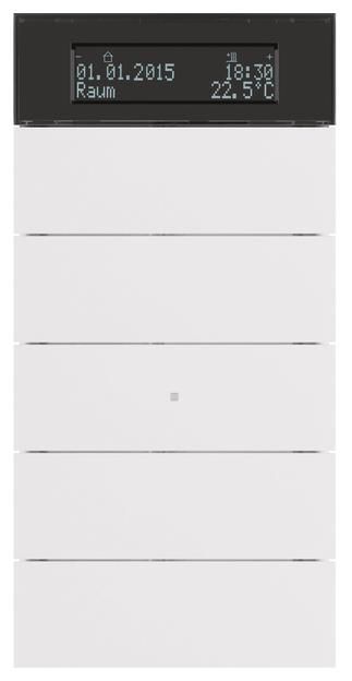 5-way push button sensor with temperature controller and display B.IQ polar white, matt. B.IQ 5-way push button sensor with temperature controller and display (RTR display), frameless, five rockers, with operating LED, blue and ten status LEDs, white, display, dark with white illuminated lettering, with dismantling protection. Flush-mounted installation. EIB user module for plugging onto bus coupler plus Up via user interface (AST). Combination device consisting of push button sensor and room temperature controller with room temperature timer and two weekly timers, 5 rockers for operating building functions in any combination, two-line display with additional symbol line, with two additional integrated buttons for setting and reading room temperature, room temperature timer, weekly timers, basic settings and display of date, time, outside temperature and 14-byte message texts (EIS 15). Display: lighting on, automatic switch-off, switching via object. Labeling possible via optional label fields, lighting via status LED. Alarm message after disconnection from the flush-mounted bus coupler as a 1-bit switching telegram, 1- or 2-byte value telegram, operation can be locked via object, touch sensor: operating concept per rocker as 2 buttons (2 objects) or rocker (1 object), button help with plain text display, button functions: switching/buttons, dimming, single-surface operation (switching/buttons, dimming, blinds) possible, blinds, value transmitter EIS 6 (1 byte), light scene recall with/without memory function, value transmitter 2 bytes, operating mode switching for controller operation, timer operation. Rocker functions: switching, dimming, blinds each with/without single-surface operation, operating mode switching for controller operation. Room temperature controller: individual room temperature control, recording of the current room temperature and processing into a control variable. Controller operation buttons to the left and right of the display: operating mode switching (comfort, standby, night, frost/heat protection mode), temperature setpoints. Operating modes: heating, cooling or heating and cooling, basic and additional heating/cooling or basic and additional heating and cooling, controller can be switched off (dew point mode) or controller or operation of the controller can be locked, valve protection function. Control types: Continuous PI control, switching PI control (PWM), switching 2-point control (on/off), presence button can be parameterized to extend comfort, temperature detection via internal and/or external sensor (averaging possible), control variable objects can be inverted, signaling objects for heating and cooling, object for controller status, preset control parameters for common heating or cooling elements, separate window contact object, room temperature timer: time-dependent adjustment of the operating modes comfort, standby, night operation, weekly program, max. 28 switching times, locking via object. Weekly timers: switching function, 1-byte value transmitter, light scene extension, max. 14 switching times, locking of the timers via object.