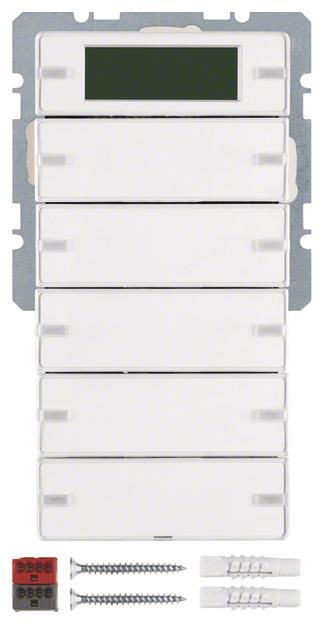 5-way push button sensor with labeling fields, RTR, display Q.1/Q.3 polar white, velvety. 5-way push button sensor with room temperature controller, display with integrated bus coupler, for local operation of switching, touch, dimming, blinds, room temperature controller functions, with dismantling protection, with white operating and ten red status LEDs, LC display with symbol representation, buttons can be fully labeled, with 2 additional display buttons for programming via display, for plugging onto bus coupler Up. Application properties: display menu scope for operation can be parameterized, display of operating mode, controller lock, room temperature, outside temperature, time (timer required), operating LED can be switched via object alarm telegram after disconnecting bus coupler 1 bit or 1 byte. Touch sensor functions: switching, touch, dimming, blind functions programmable, function 2 telegrams programmable, value transmitter for dimming, brightness and temperature values 1 and 2 bytes, calling up, setting and saving of 8 light scenes, cyclical sending also possible via extension, buttons or rockers can be parameterized, single-surface operation for switching, buttons, blinds and dimming, area dimming, blind operating concepts short-long-short and long-short can be parameterized, rockers or touch sensor can be locked via object Room temperature control function: with room temperature timer. For individual single room control, controller operating modes comfort, standby, night and frost/heat protection operation. For heating and/or cooling operation with/without additional stage, control parameters for heating or cooling elements preset. For continuous or switching control of max. 2 control circuits, temperature measurement via internal and/or external sensor with averaging, presence button programmable on touch sensor for comfort extension, touch sensor buttons as controller extension and for operating mode switching, setpoint shift, room temperature timer operation programmable, separate window contact object, reporting objects for heating and cooling, with valve protection function, object for controller status. Flush-mounted installation, surface program. Material: plastic, thermoplastic, shatter-proof, high-gloss surface, halogen-free.
