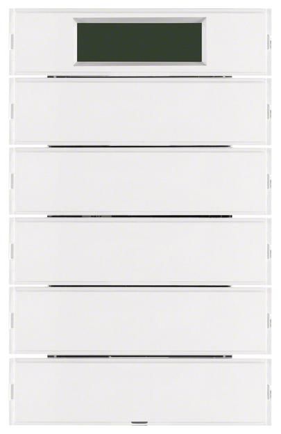 5-way push button sensor with RTR, display K.1. 5-way push button sensor with room temperature controller, display for local operation of switching, touch, dimming, blinds, room temperature controller functions, with dismantling protection, with white operating and ten red status LEDs, LC display with symbol representation, buttons can be written on over the entire surface, with 2 additional display buttons for programming via display, for plugging onto bus coupler Up. Application properties: display menu scope for operation can be parameterized, display of operating mode, controller lock, room and outside temperature, time (timer required), operating LED can be switched via object alarm telegram after disconnecting bus coupler 1 bit or 1 byte. Touch sensor functions: Switching, touch, dimming, blind functions programmable, function 2 telegrams programmable, value transmitter for dimming, brightness and temperature values 1 and 2 bytes, extension for light scene touch sensor, cyclical sending also possible via extension, buttons or rockers can be parameterized, single-surface operation for switching, buttons, blinds and dimming, area dimming, blind operating concepts short-long-short and long-short can be parameterized, rockers or touch sensor can be locked via object. Room temperature control function: with room temperature timer. For individual single room control, controller operating modes comfort, standby, night and frost/heat protection operation. For heating and/or cooling operation with/without additional stage, control parameters for heating or cooling elements preset. For continuous or switching control of max. 2 control circuits, temperature measurement via internal and/or external sensor with averaging, presence button programmable on touch sensor for comfort extension, touch sensor buttons as controller extension and for operating mode switching, setpoint shift, room temperature timer operation programmable, separate window contact object, reporting objects for heating and cooling, with valve protection function, object for controller status. Flush-mounted installation, surface program. Material: plastic, thermoplastic, shatter-proof, high-gloss surface, halogen-free.