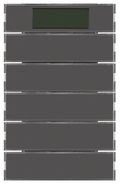 5-way push button sensor with RTR, display K.1 anthracite. 5-way push button sensor with room temperature controller, display for local operation of switching, touch, dimming, blinds, room temperature controller functions, with dismantling protection, with white operating and ten red status LEDs, LC display with symbol representation, buttons can be written on over the entire surface, with 2 additional display buttons for programming via display, for plugging onto bus coupler Up. Application properties: display menu scope for operation can be parameterized, display of operating mode, controller lock, room and outside temperature, time (timer required), operating LED can be switched via object alarm telegram after disconnecting bus coupler 1 bit or 1 byte. Touch sensor functions: Switching, touch, dimming, blind functions programmable, function 2 telegrams programmable, value transmitter for dimming, brightness and temperature values 1 and 2 bytes, extension for light scene touch sensor, cyclical sending also possible via extension, buttons or rockers can be parameterized, single-surface operation for switching, buttons, blinds and dimming, area dimming, blind operating concepts short-long-short and long-short can be parameterized, rockers or touch sensor can be locked via object. Room temperature control function: with room temperature timer. For individual single room control, controller operating modes comfort, standby, night and frost/heat protection operation. For heating and/or cooling operation with/without additional stage, control parameters for heating or cooling elements preset. For continuous or switching control of max. 2 control circuits, temperature measurement via internal and/or external sensor with averaging, presence button programmable on touch sensor for comfort extension, touch sensor buttons as controller extension and for operating mode switching, setpoint shift, room temperature timer operation programmable, separate window contact object, reporting objects for heating and cooling, with valve protection function, object for controller status. Flush-mounted installation, surface program. Material: plastic, thermoplastic, shatter-proof, high-gloss surface, halogen-free.