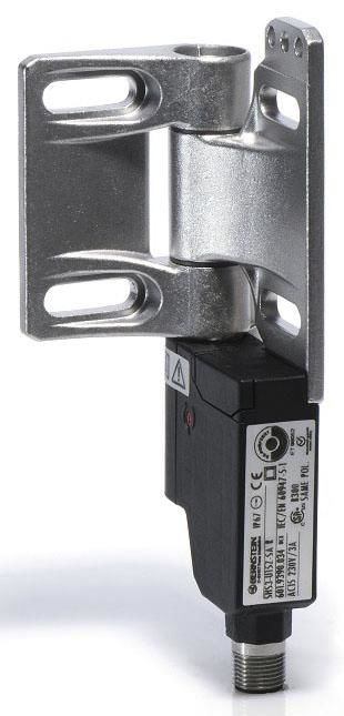 . Stainless steel hinge with integrated safety switch in plastic housing