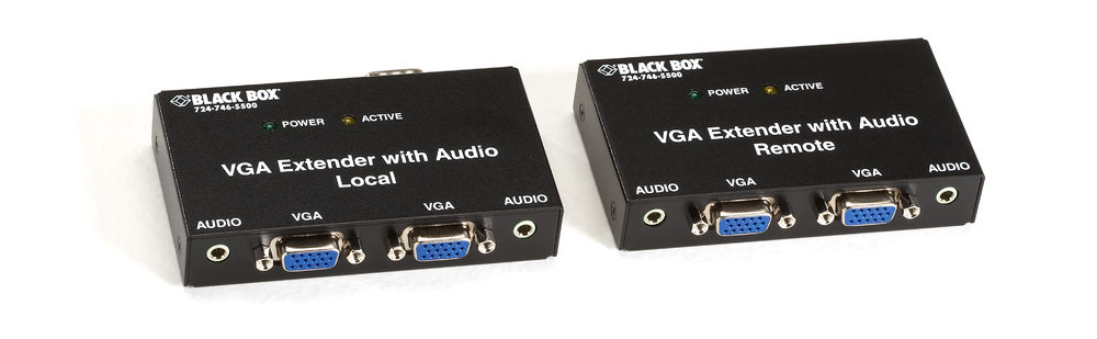 BLACK BOX VGA Extenders allow you to transmit VGA signals or VGA and audio signals up to 152.4 m over standard twisted-pair cable (CAT5, CAT5e, or CAT6). These extenders are perfect for use in video distribution or digital signage applications in schools, hospitals, retail stores, airports, bus stations, and many other settings.The extender supports both local and remote VGA monitors. Each kit consists of a local unit and a remote unit, as well as a VGA cable to connect the local unit’s HD15 input connector to your VGA source.