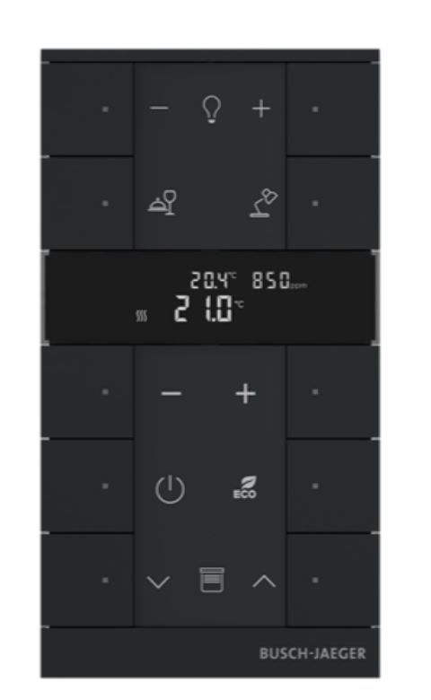 Display of operating mode, temperature, fan coil level, humidity value, CO2 value
