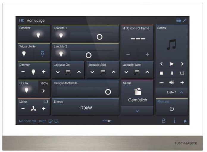 For central control of up to 100 configurable Busch-free@home® or Busch-Installationbus® KNX functions of the type: switching, dimming, blinds, RTR, scene, Philips HUE.
