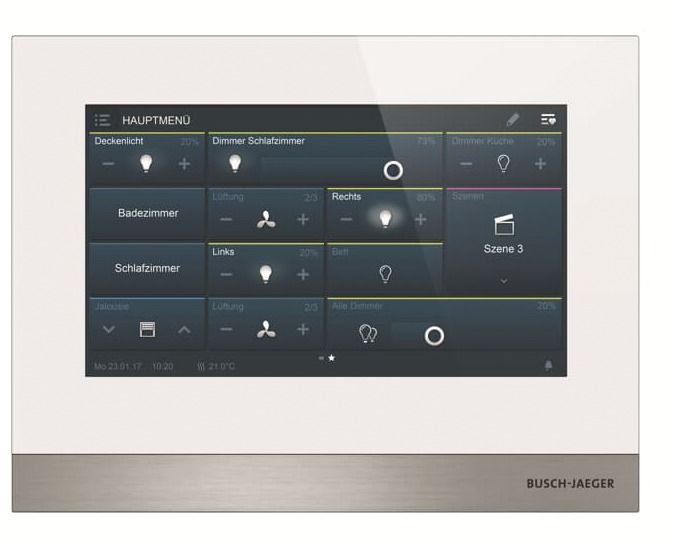 For central control of up to 64 configurable Busch-free@home® or Busch-Installationbus® KNX functions of the type: switching, dimming, blinds, RTR, scene, Philips HUE.