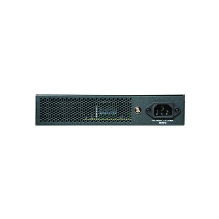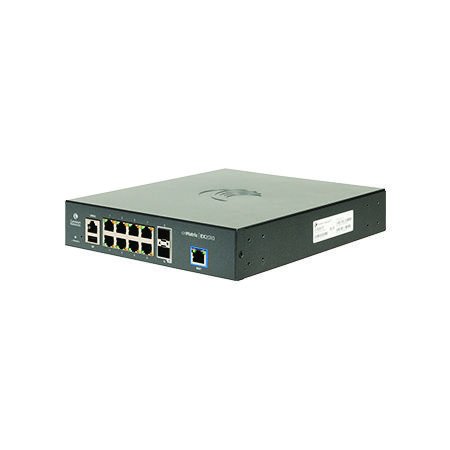 Intelligent Ethernet Switch, 8 x 1G and 2 SFP fiber ports, no power cord, L2 < L3 functionality, extensive QoS, ACL, Filtering, 20 Gbps switching capacity, 16384 MAC Addresses, 1024 ARP Entries, 4094 VLANs, LACP/Trunking, 8 x QoS Prioritry Queues, policy based Auto-Configuration, auto-policy wipe, wireless aware, Cloud management and On-Premises cnMaestro, rack mount kit, USB port, Serial console
