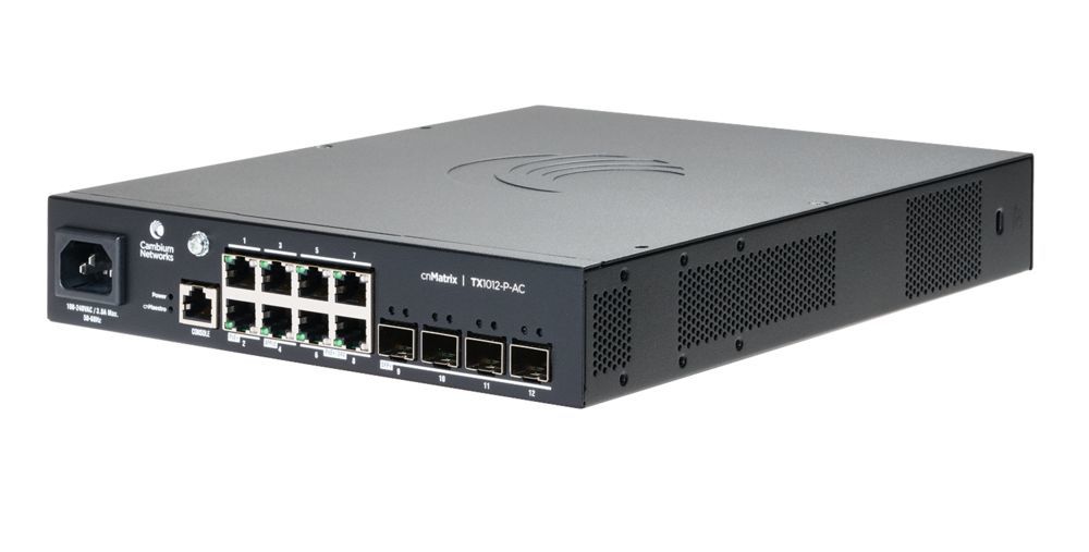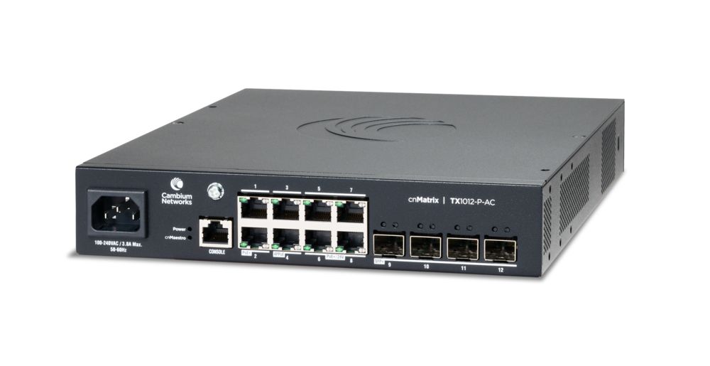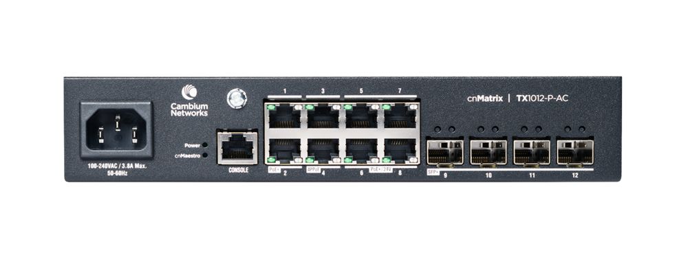 The article Cambium Networks MXTX1012GxPA00 Cambium Switch fully managed Layer3 12 Port? 8x 1GbE? PoE budget 200 watts? 8x PoE bt? 4x SFP+? 10? ? cnMaestro? TX1012-P-AC is currently in stock