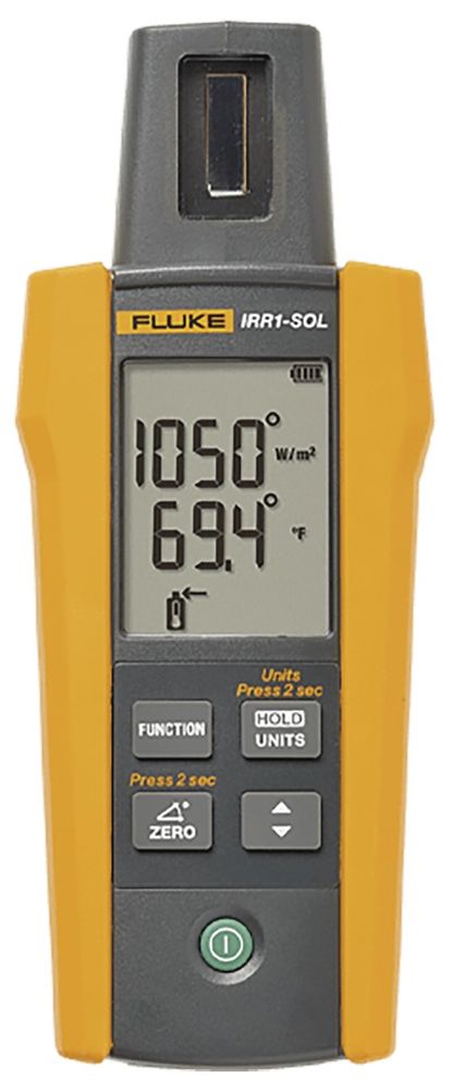 The Fluke IRR1-SOL irradiance meter is designed to simplify the installation, commissioning and troubleshooting of photovoltaic systems. Allows you to measure the irradiance, temperature and tilt of solar modules with a single handheld device.