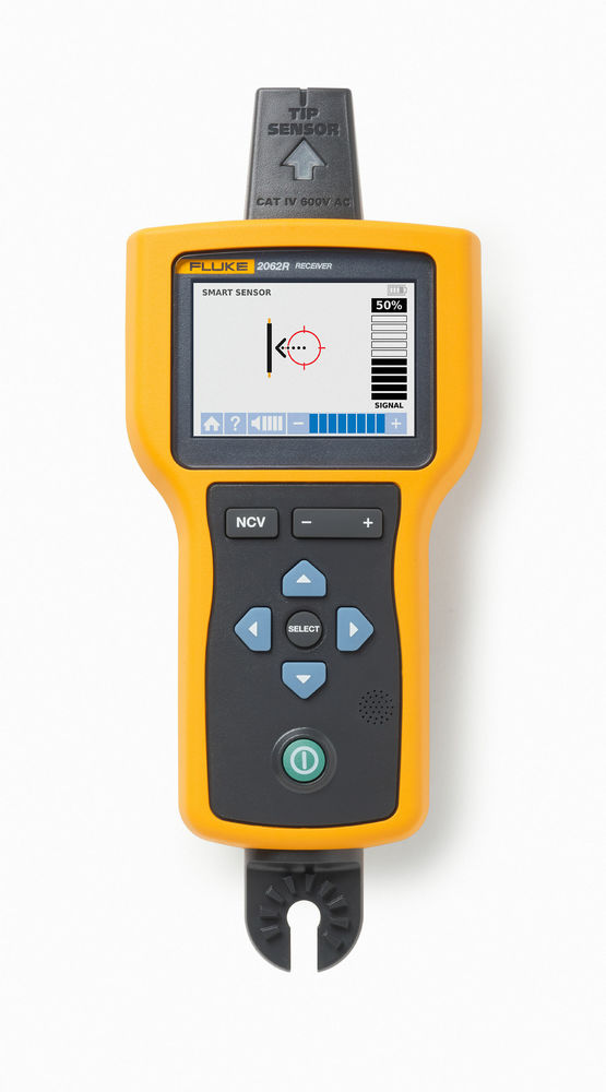 The Fluke 2062 Advanced Pro line detector enables precise and safe troubleshooting of live and dead lines in residential, commercial and industrial environments according to measurement category CAT IV 600 V. This makes it the safest line detector of its kind. The device is designed to protect you from the most dangerous transient overvoltages, i.e. voltage spikes of up to 8,000 V, that can occur in industrial and utility environments. This is especially important for applications in industrial plants, factories and hospitals where important equipment cannot be switched off. The patented Smart SensorT, which is only available in the Fluke 2062, makes locating lines faster and easier. It locates live lines in walls, floors and ceilings and displays them on a high-resolution 8.9 cm (3.5') TFT LC color screen. Embedded help windows on the screen make operation easier for both novices and experts. While the Tip Sensor emits an audible signal when locating lines, the Smart Sensor helps visualize and accurately determine the orientation of live lines, eliminating uncertainty. Whether troubleshooting electrical lines and equipment in homes, commercial buildings, or high-voltage systems, the Fluke 2062 will find opens and shorts. Its various modes and functions give you the flexibility to troubleshoot a variety of electrical line and circuit problems you might encounter in your work. The Fluke 2062 Advanced Pro Line Detector Kit comes equipped with everything you need to locate lines and circuits. The accessory kit includes test leads, test probes, adapters for round and flat-contact sockets, and alligator clips for connecting the transmitter to electrical systems. Connecting the transmitter to a bare conductor using the included alligator clips and test leads will always give you the most accurate results. In situations where a direct connection to a bare conductor is not possible, the supplied i400 current clamp can be used with the 'Loop' mode to induce an amplified 6 kHz signal through the insulation. The kit also includes a magnetic holder with strap, batteries and a hard carrying case.