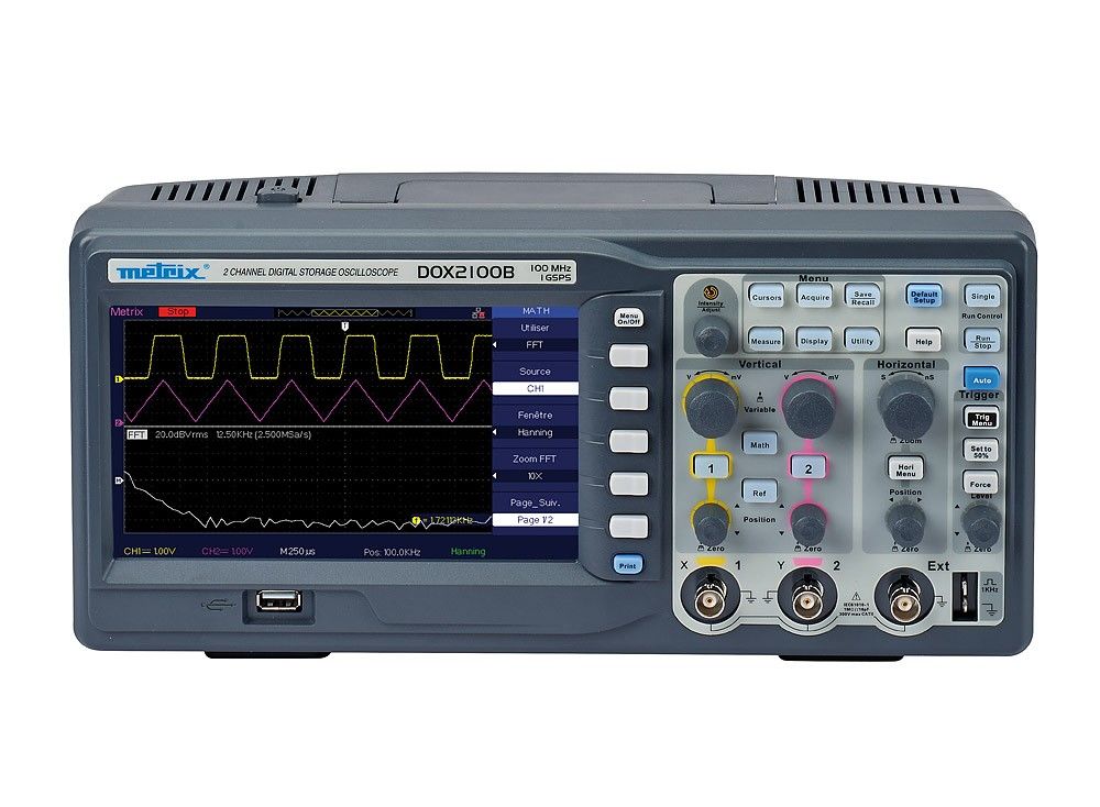 The METRIX DOX2100B is a high-performance, digital benchtop oscilloscope that is easy to operate, with a compact design specifically suited for laboratory use. With two channels and a bandwidth of up to 100 MHz, the DOX2100B enables precise signal recording and in-depth analysis. The maximum sampling rate is 500 MS/s with two channels, 1 GS/s with a single channel in Single Shot mode, and up to 50 GS/s in repetitive mode.