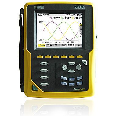 Analyzer CA8332B QUALITEST STAR Chauvin Arnoux complete with 3 pcs A193/450mm Ampflex., The network analyzer, Which puts you in the picture! Qualistar The CA 8332B is Mainly Aimed at testing and maintenance services of industrial, commercial or office buildings. It provides . immediate picture of the quality of the mains supply, despite its handiness and compact dimensions, the device offers Numerous calculation and evaluation facilities and highlights LCD color display with graphics function 3 display modes:. monitoring, troubleshooting, monitoring Complete analysis of phase networks: Voltages, currents, power, energy harmonics (up to rank 50), flicker, alarm minimum recording duration: 21 minutes (all the parameters with the smallest storage interval of 1 second) analysis of the data using computer software 2 MB RAM recording of up to 8 screenshots and curves Meets IEC 61010-1, Cat III 600V 3 years warranty Dimensions: W180 x D55 x H240 Weight: 1.5kg with battery power supply. 110 V and 230 V NiMH battery (9.6 V - 1800mAh) - Operating time about 5 hours Standard Package: Unit 8332B with battery pack of 3 Ampflex A193/450mm software QualistarView optical interface cable DB9M 4-voltage lines banana / banana L = 3m 4 alligator clips User Manual 1 Power Cord evaluation Power Analyser Transfer (Included): device configuration: Setup, records, alarms, analysis of the recorded data and alarms, transmission of screen printing and transients, export data to spreadsheet Optional: further Clamp Optional software DATAVIEW software DATAVIEW (optional), this professional software displays on any computer online "" the signal shapes as well as from analyzer Carried out on real-time measurements., the user has to transfer (selection under all the Qualistar measurement parameters) and its data Quickly and Directly from your PC the ability to configure the instrument. DATA View ®, measurement protocols generated Automatically and on demand new custom protocols. He Suggests a givenName protocol in the form of a table, in Which the parameters of the standard EN 50160 are Summarized, so did the conformity of the network with this standard can be verified point by point More over, this instrument offers Numerous other functions for the convenience of the user, or for more advanced analysis. zooming the charts to analyze Certain sections shown on request display of various stored parameters, export the data stored in Excel, interconnection and integration of objects (OLE) changes and errors ""
