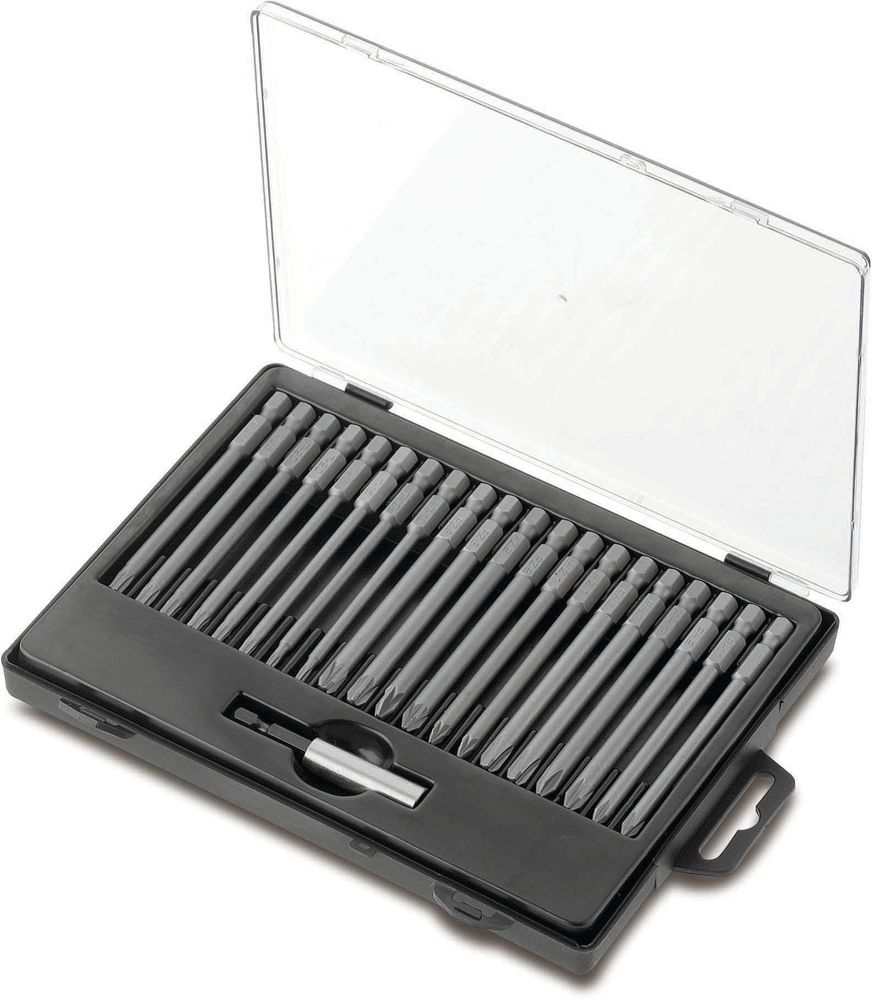 21-piece set consisting of 1 universal holder with permanent magnet, length 60 mm, each two piece bits Phillips Philips PH 1, PH 2, PH 3, Phillips Pozidriv PZ 1, PZ 2, PZ 3, TORX (R) Size T 10 - T 15 - T 20 - 25 T, bit lengths of 90 mm ​​Type: 114602