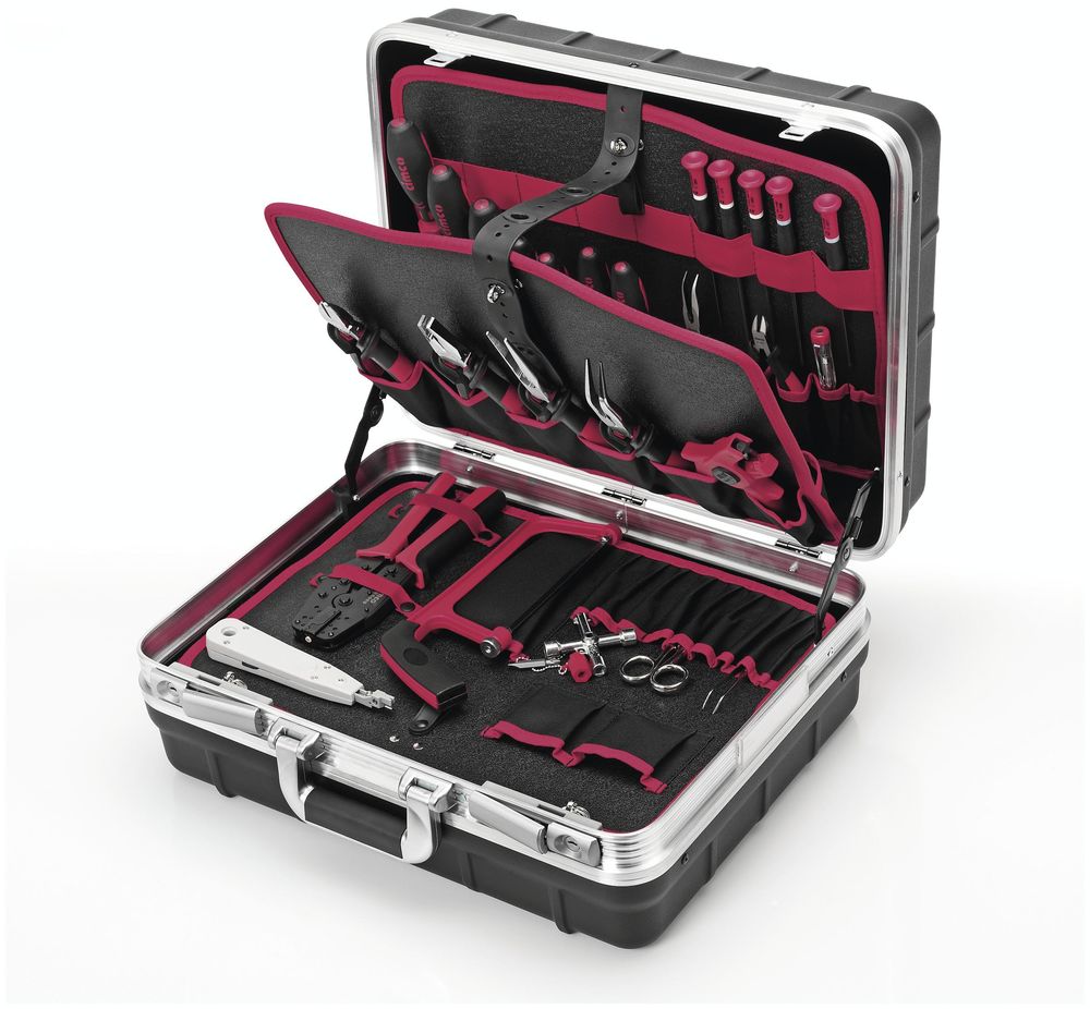 Champion tool case 'Data and network technology', equipped. Professional hard-shell case with a wide aluminum frame for high stability. The case shells are made of extremely impact- and drop-resistant polypropylene. The particularly spacious base shell with various bars is used for sensible division into small compartments. 3 tool boards with many pockets in different sizes ensure safe storage of all kinds of hand tools. The 3 metal hinges with locking mechanism keep the case securely open without additional struts. Comfortable carrying handle with soft rubber insert as well as 2 robust lockable snap locks and name plate. The case is equipped with the following tools: 1000 V telephone pliers with straight jaws 200 mm, DIN ISO 5745 (-Article no. 17 0216), 1000 V telephone pliers with curved jaws 200 mm, DIN ISO 5745 (1000 V telephone pliers with curved jaws 200 mm, DIN ISO 5745 1 10 02310 0238. 1000 V combination pliers (-Article no. 10 0336), 1000 V side cutters 160 mm, DIN ISO 5749B (-Article no. 10 0574), wire strippers Super 4 (10 0760), electronic side cutters 120 mm, oval-round head, angled, with cutting edge (-Article no. 10 0802), electronic needle-nose pliers 150 mm, with curved cutting edge, smooth jaws, tip 2.5x1.5 mm (-Article no. 10 0816)200 mm, DIN ISO 5745 1 10 02310 0802), 1 x electronic needle-nose pliers (10 0816), 1 tweezers, 120 mm (-Article no. 10 3016), 1 press pliers system click`n`crimp data network technology (-Article no. 10 6009), 1 phase tester 120-250 V AC, 3.0/65 mm (-Article no. 11 1280), 1 precision slotted screwdriver 2.0x0.4x60 mm (-Article no. 11 1864), 1 precision slotted screwdriver 2.5x0.4x75 mm (-Article no. 11 1865), 1 precision slotted screwdriver 4.0x0.8x150 mm (-Article no. 11 1870), 1 precision Phillips screwdriver, light blue PH 0x60 mm (-Article no. 11 1877), 1 precision Phillips screwdriver, light blue, PH 0x80 mm (CIMCXO-Article no. 11 1880), universal control cabinet key made of zinc die-cast (-Article no. 11 2894), 1000 V slotted screwdriver 160 mm, DIN EN 60900, 2.5x0.4 mm (-Article no. 11 7701), 1000 V slotted screwdriver, DIN EN 60900, 3.0x 0.5 mm (-Article no. 1000 V slotted screwdriver 185 mm, DIN EN 60900, 3.0x0.5 mm (-Article no. 11 7702), 1000 V slotted screwdriver 185 mm, 4.0x0.8 (-Article no. 11 7704), 1000 V slotted screwdriver 220 mm, 5.5x 1.0 (-Article no. 11 7705), 1000 V slotted screwdriver 245 mm, 6.5x1.2 (-Article no. 11 7706), 1 Phillips screwdriver with 1000 V protective insulation PH 1, 80 mm, (-Article no. 11 7731), Phillips screwdriver with 1000 V protective insulation PH 2, 100 mm, (-Article no. 11 7732), LSA-Plus terminal insertion tool, model Economy AWG 24-20 (-Article no. 11 8017)), Jokari cable stripper COAXI, with a Ø of 4.8-7.5 mm (-Article no. 12 0027), Jokari precision stripper. PWS-Plus, red push button, with a Ø of 0.25-0.80 mm, AWG 30-20 (-Article no. 12 0033), Jokari stripper PC-Strip,with a diameter of 5-13 mm cable, 0.2-4.0 mm² conductor (-Article no. 12 0034), universal scissors 190 mm, hardness HRC 56 to 58 (-Article no. 12 0122), telephone scissors with serrated blade, bright nickel-plated. Size: 130 mm (-Article no. 12 0222), PUK pocket saw, with solid, varnished wooden handle, span 150 mm (-Article no. 12 0502), Jokari cable knife with hook blade with a diameter of 8-28 mm (-Article no. 12 1010). Case equipped with a weight of 8000 g, external dimensions W/D/H: 478/410/219 mm, internal dimensions W/D/H1/H2/H#: 465/352/70/145/215 mm.